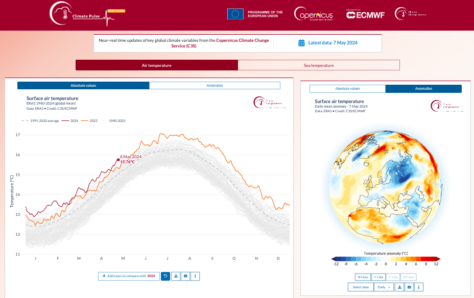 Daily Temperature: The tool gives access to near-realtime daily air and sea surface temperature as global maps and as global averages. To see flat maps of the air and sea surface temperature click on the camera symbol.
