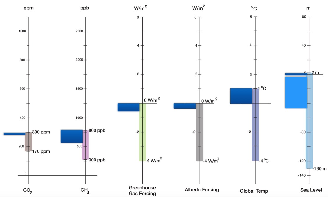Figure 2: Base Line for the normal ranges of climate-related variables during the last 800,000 years and during the Holocene (dark blue boxes). Read more about normal ranges ... The stability of the climate in the Holocene is exceptional, and this stability was extremely favorable for humanity. In fact, it created a safe operating space for humanity (Rockstrom et al., 2009). The stable climate supported humanity's transition to agriculture. When sea level becames stable, humans could for the first time develop permanent settlements in large river deltas and benefit from the logistic advanatges and the rich ecosystem services these areas offered. When global sea level was changing at rate of meters per century, it was not possible to settle in these beneficial areas because of the flat topography, coast lines where moving horizontally often 50 to 100 km in a century.