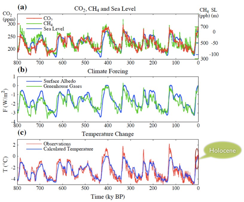 Figure 1: Paleo data for climate-related variables for the last 800,000 years. The Holocene, the last geological epoch, was exceptionally stable. From Hansen et al. (2008). Figure 1 shows data for a number of climate-related variables for the last 800,000 years. During this period, climate was characterized by an alternating sequence of ice ages and interglacial warm periods. There is a strong correlation between changes in mean global air temperature, climate forcing variables such as albedo and greenhouse gasses, and sea level. The total range of global mean temperature throughout this long period was only on the order of 5oC. The corresponding range of atmospheric carbon dioxide (CO2) was on the order of 130 ppm, while sea level changed as much as 130 m. Thus, the long-term correlation between atmospheric CO2 is that 130 ppm correspond to 130 m in sea level and to 5oC in mean global air temperature. Utilizing the data in Figure 1, we can construct a base line as shown in Figure 2. The base line for the last 800,000 years shows relativley small ranges of variations in the most important climate variables. The total range of the mean global atmospheric temperature is less than 5oC, and the range of atmospheric CO2 is only 130 ppm. Methan (CH4) has a total range of 500 ppb and the combined Greenhouse gas climate forcing is limited to range of 4 W/m2.The variablility of climate forcing due to the albedo of the earth surface also is in a range of 4 W/m2. Changes in global mean sea level caused by the climate variability exhibt a range of 130 m, which introduced very large variations in the location of the coastal zones along the land-ocean boundary. Constraining the time interval to the Holocene, the total ranges for each variable are dramatically reduced. Here we consider the Holocene as the epoch that started approximately 11,700 years ago and ended with the full impact of the industrialization becoming clearly visible in Earth system variables. The dark blue boxes in Figure 2 show the ranges for each variable during the Holocene up to approximately 1880. Variations in the global mean temperature were limited to only 1oC with changes on century time scales being restricted to only one or two tenth of 1oC/century (Figure 3). The range of atmospheric CO2 is only roughly 15 ppm, and only methan shows a relatively larger range.